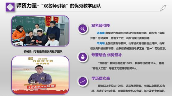 专业优势:机械设计与制造专业是我院老牌特色品牌专业,实训设备先进,现有3门省级精品课程,6门院级精品课程,拥有山东省磁悬浮精密制造应用技术协同创新中心、山东省智能装备制造新旧动能转换公共实训基地等省市级平台10余个。荣获第六届中国国际“互联网+”大学生创新创业大赛金奖1项和“挑战杯”中国大学生创业计划竞赛金奖1项、银奖1项、 “挑战杯”全国大学生课外学术科技作品竞赛三等奖,其余国家级“双创”大赛15余项;山东省职业技能大赛、山东省大学生科技创新大赛、“互联网+”创新创业大赛、机电产品设计竞赛、CAD制图设计大赛等省级奖项180余项。