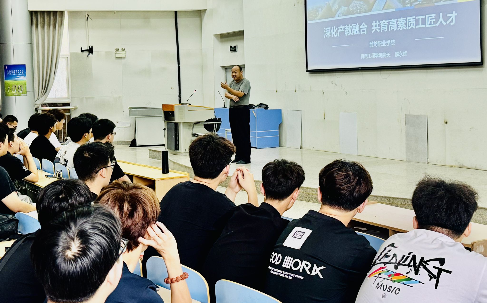 “开学第一课”以“回望历史,做自信自强潍职人”为开篇。机电工程学院主要负责同志围绕学院办学历史、专业特色、大赛获奖和发展前景等方面进行详细介绍,勉励新生珍惜时光、勤奋学习、筑梦未来。他指出,在当前制造业转型升级的背景下,机电专业人才面临广阔的发展空间和就业机遇,职业教育现场工程师专项培养计划是教育部首批立项的高技能人才培育项目,也是深化中国特色学徒制、支撑新型工业化战略的重要举措,旨在培养“精操作、懂工艺、会管理、善协作、能创新”的高素质技能人才,为制造强国建设贡献力量。随后,企业教师围绕现场工程师岗位需求、日常管理及职业规划等内容作主题分享,帮助学生全面了解学院文化与要求,为后续学习做好准备。