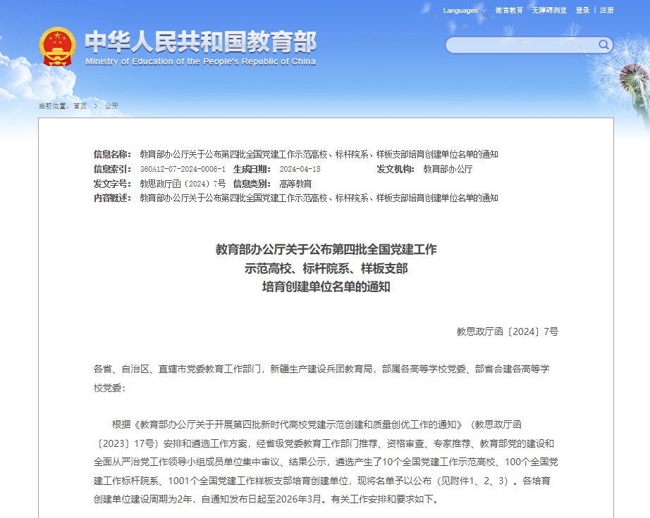 近日,教育部办公厅公布了第四批全国党建工作示范高校、标杆院系、样板支部培育创建单位名单,共遴选产生了10个全国党建工作示范高校、100个全国党建工作标杆院系、1001个全国党建工作样板支部。机电工程学院教师第二党支部成功入选“全国党建工作样板支部”培育创建单位。