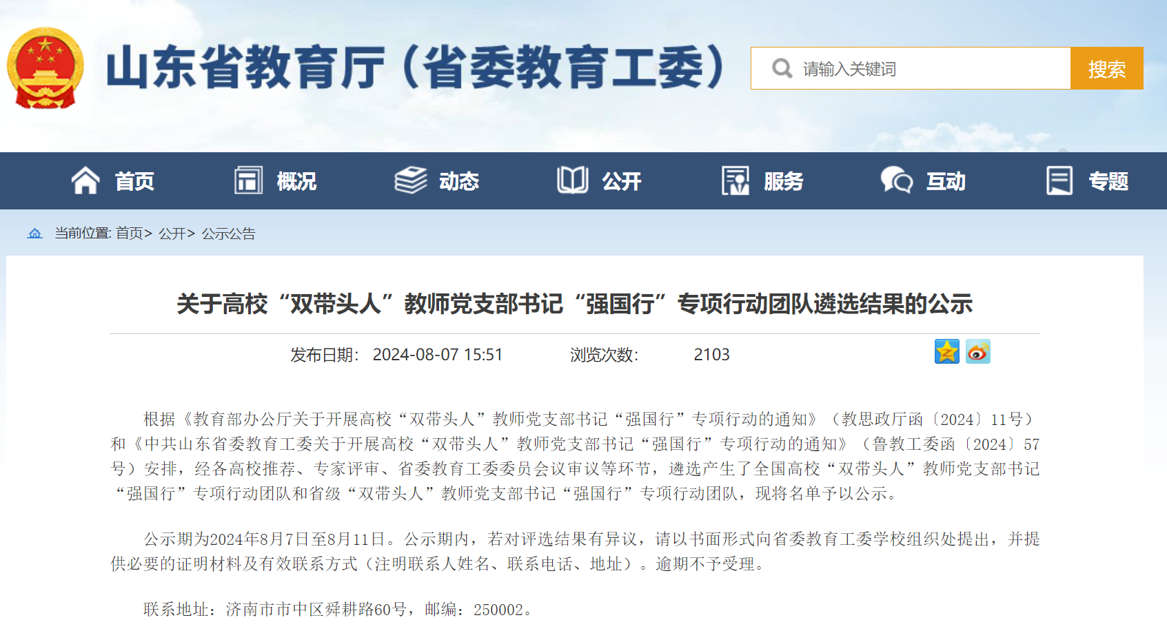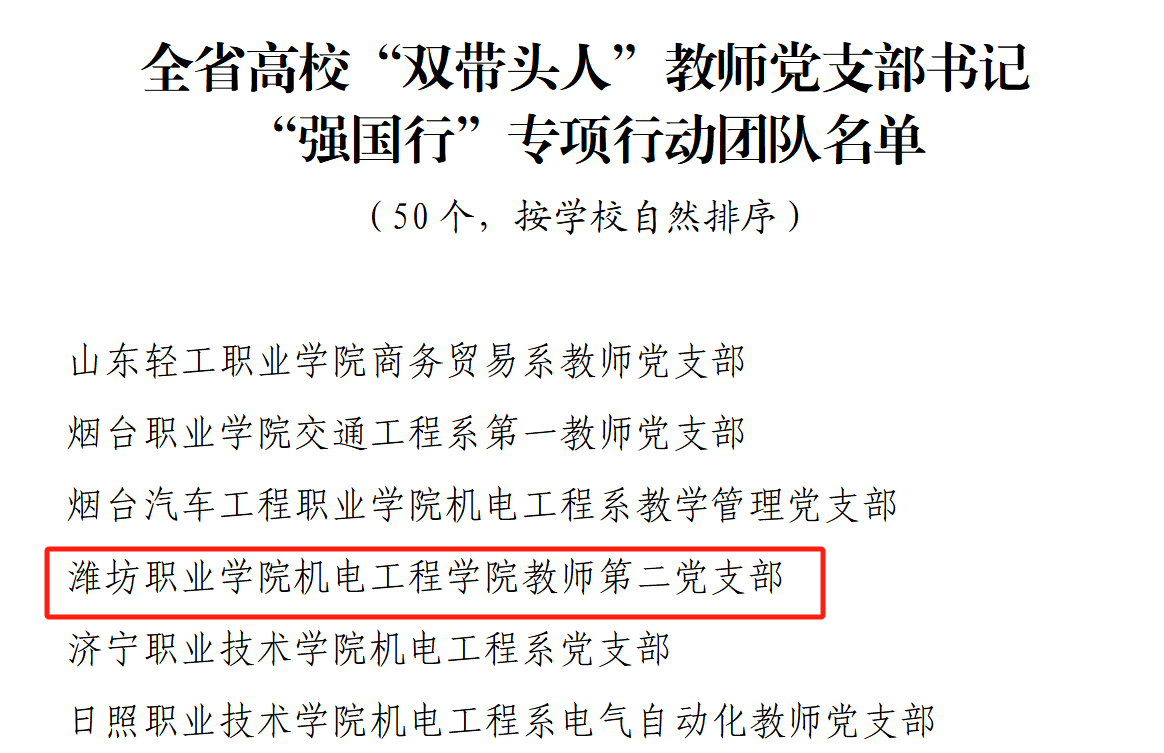 近日,山东省教育厅公布了高校“双带头人”教师党支部书记“强国行”专项行动团队遴选名单,本次评选经各高校推荐、专家评审、省委教育工委委员会议审议等环节,共遴选产生了72支全国高校“双带头人”教师党支部书记“强国行”专项行动团队和50支省级“双带头人”教师党支部书记“强国行”专项行动团队。机电工程学院教师第二党支部成功获评全省高校“双带头人”教师党支部书记“强国行”专项行动团队。