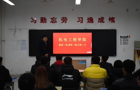 本次活动作为机电工程学院“晨读一语,周明一理,月养一习”文明养成教育系列活动之一,一经开展就得到了老师和同学们的积极响应。机电工程学院团总支通过开展“诵读经典比赛”为契机,借助微信、抖音等新媒体平台宣传引导经典晨读活动,营造良好的诵读氛围。各班纷纷召开主题班会,宣传此次活动精神,倡导同学们要把读书当成一种态度,一种责任和精神追求。各班级通过组建图书角、开展经典晨读心得交流、撰写经典晨读心得体会等多途径、多形式提高学生阅读兴趣,激发同学们的学习的热清。“晨读接让我熟知了更多国学经典,提升了个人内在修养”“晨读使我有效利用时间,养成良好的生活习惯。”很多同学在参加晨读活动后纷纷发表了参加此次活动的感想。