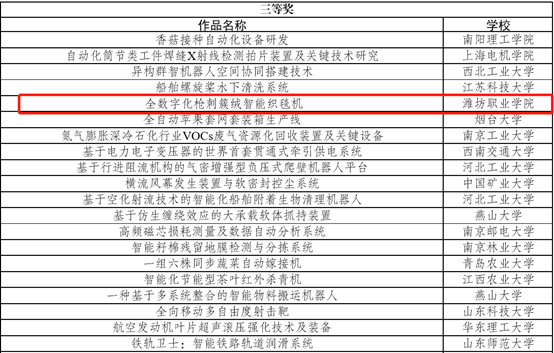 近日,由共青团中央、中国科协、教育部、中国社会科学院、全国学联和北京市人民政府共同主办的第十六届“挑战杯”全国大学生课外学术科技作品竞赛在北京航天航空大学落下帷幕。由我院机电工程学院辛海明、郭大路老师指导的刘月昊、姜云飞、辛丽萍、张昌鹏、胡芳娟、孙凯、魏柯等学生负责《全数字化枪刺簇绒智能织毯机》入围国赛并荣获三等奖第五名,来自全国1423所高职院校中仅14所职业院校获奖。