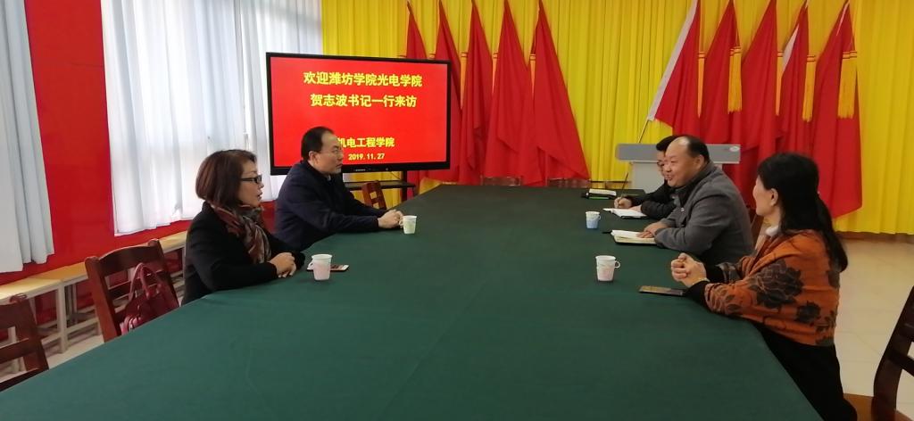 11月27日上午,潍坊学院物理与光电工程学院贺志波书记一行2人到机电工程学院洽谈交流,机电工程学院负责人及相关教师参加活动。