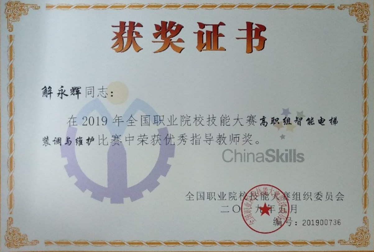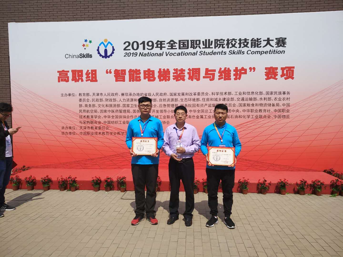 5月6日至8日,2019年全国职业院校技能大赛高职组“智能电梯装调与维护”赛项在天津轻工职业技术学院举行,来自全国的90支代表队参赛。机电工程学院选派2017级电梯工程技术班学生袭著臣、高鹏,指导教师王昌、程义民、解永辉组成的山东三队参加比赛并获得团体一等奖,这是我院连续五届获得该赛项国赛一等奖。