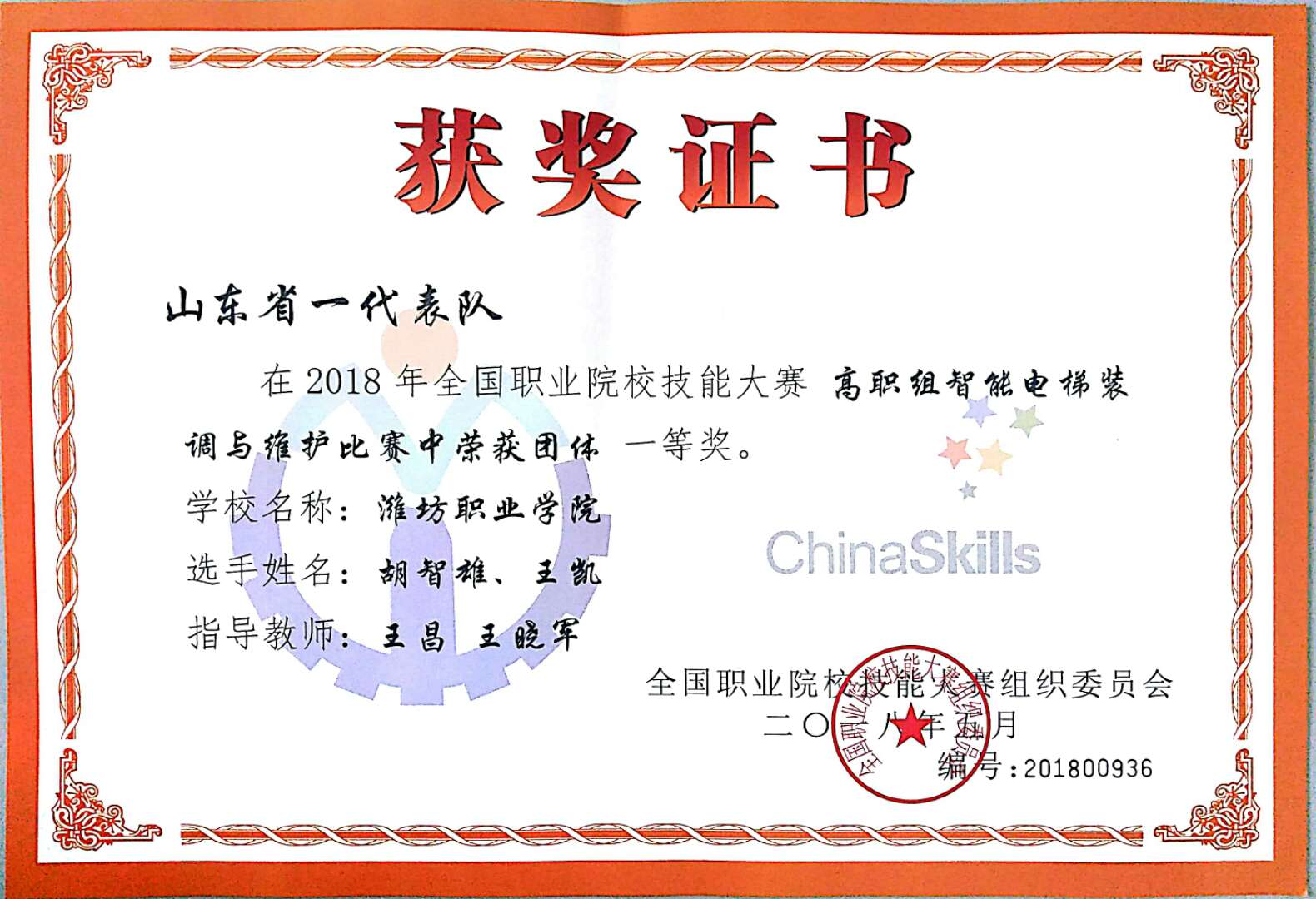 5月6日至8日,2018年全国职业院校技能大赛高职组“智能电梯装调与维护”赛项在天津轻工职业技术学院举行。来自全国的81支代表队参赛。我院机电工程学院选派学生王凯、胡智雄,指导教师程义民、王昌、王晓军组成的山东一队参加了比赛,获得团体一等奖第一名,我院连续四届均获得该赛项国赛一等奖。