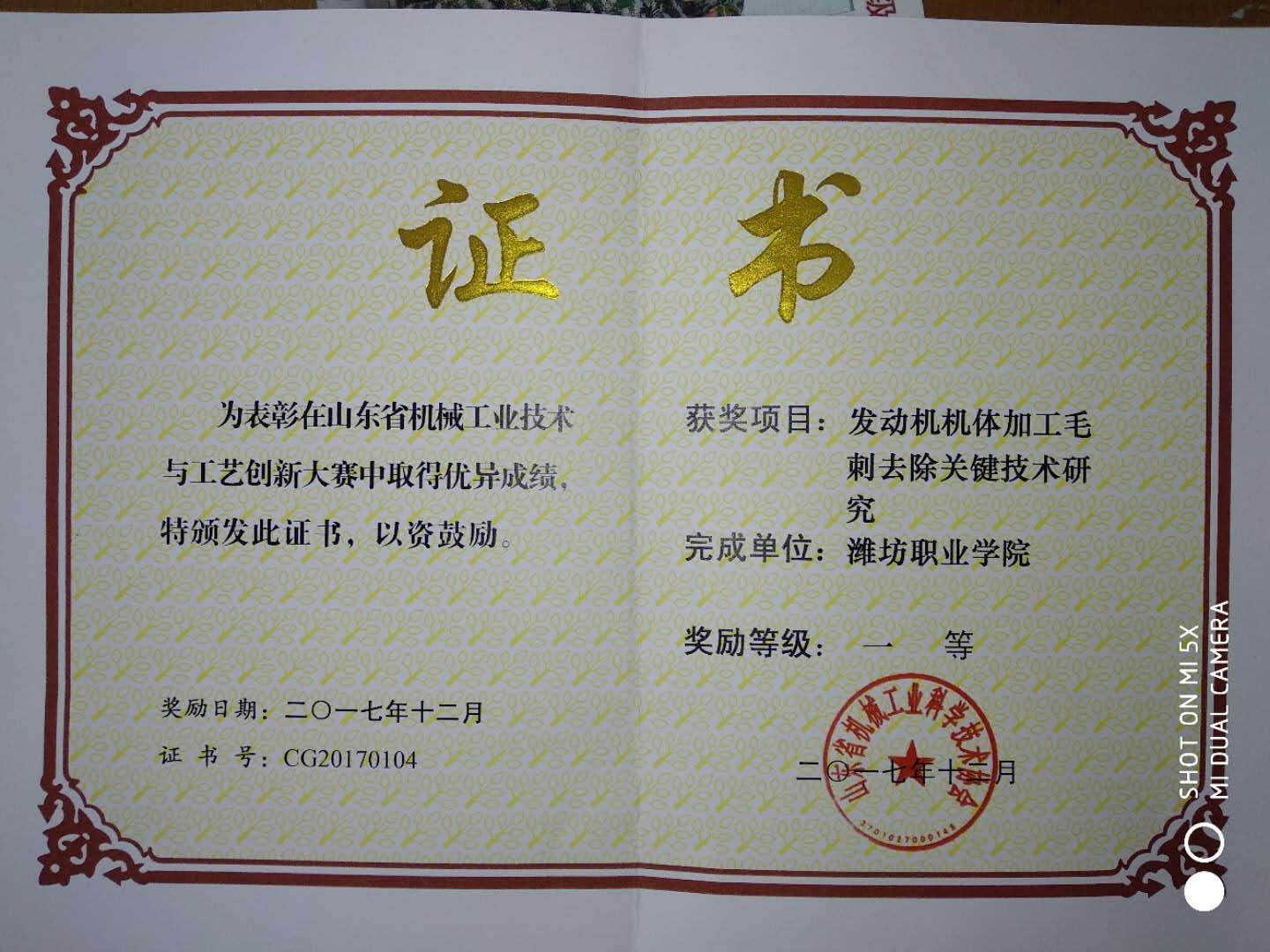 与会领导专家介绍了全省对外贸易情况及政策、“工业设备全球市场(欧美俄)准入准则”、“在线展览助推山东装备制造业走出去及成功案例”,期间颁发了“2017第二届山东省机械工业技术与工艺创新大赛”奖章、证书,我院李海庆老师申报的“发动机机体加工毛刺去除关键技术研究”获得一等奖,并荣获“五一劳动奖章”。