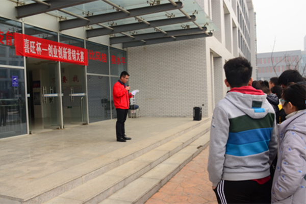 喜旺集团潍坊地区经理王阳在开赛式上致辞。他说,举办“喜旺杯”创新创业营销大赛目的是让同学们将理论和实践结合起来学以致用,同时扩大喜旺品牌在高校市场的影响力。本届‘喜旺杯’创新创业营销大赛将以鲜明的主题凝聚学生,以真实的营销环境锻炼学生,以宽阔的舞台展示学生,以丰富的营销策略培养学生,充分发挥学生的主观能动性。