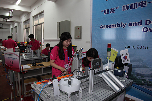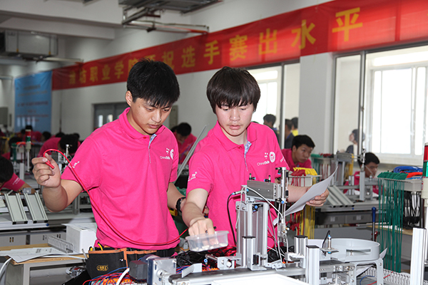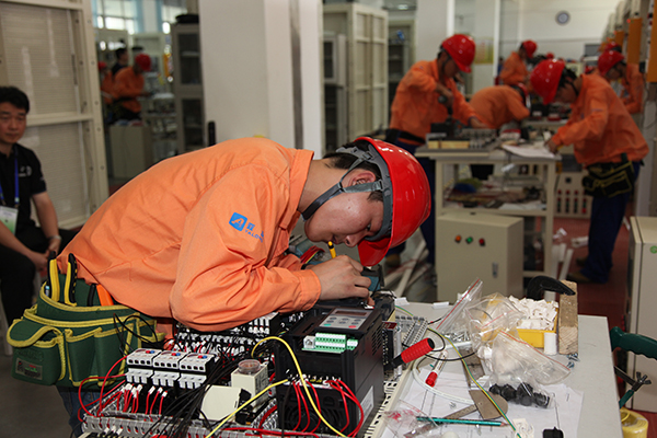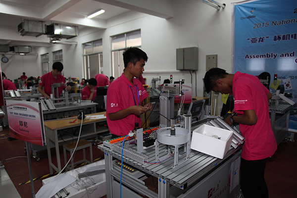 竞赛以团体赛方式进行。按照设定的竞赛内容,电气安装与维修赛项选手要在规定的时间内完成配用电装置、照明装置和弱点装置的安装,控制电路的连接、相关元件的参数设置,排除赛场提供的某生产设备电气控制电路板上所设置的故障等5个方面的工作任务;机电一体化设备组装与调试赛项选手则要完成按组装图组装机电一体化设备和相关部件、按机电一体化设备的电气控制原理图连接电路、根据机电一体化设备的工作说明和要求编写PLC控制程序与设置变频器参数等7个方面的工作任务。