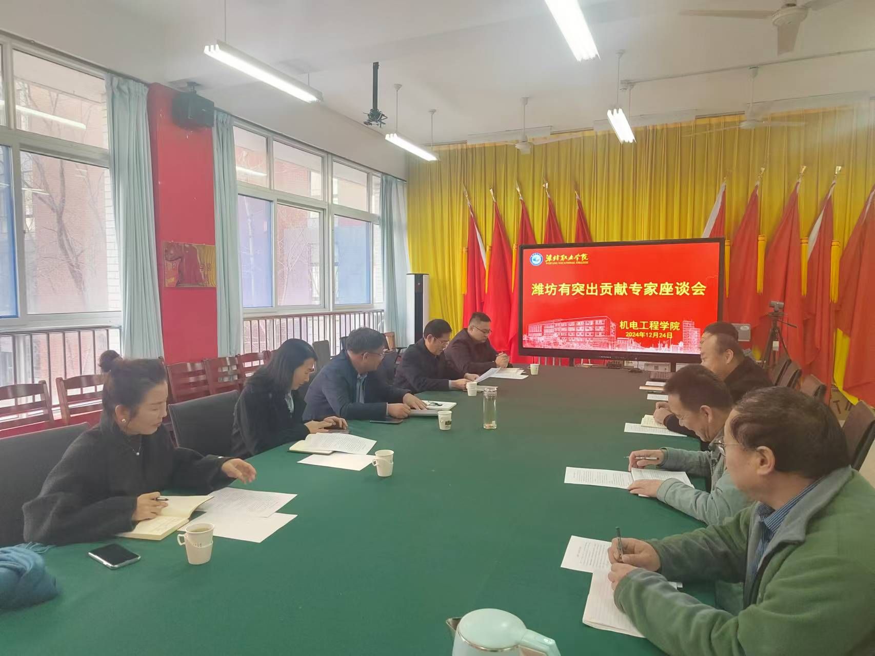 近日,我院教师王晓军获评“潍坊有突出贡献专家”。12月24日,学院党委副书记韩瑞东,党委委员、纪委书记、监察专员王国成,党委委员、办公室(统战部)主任(部长)刘志艳,党委委员、组织人事处(离退休工作处)处长于涛,教师工作部部长一行赴机电工程学院参加潍坊有突出贡献专家座谈会,机电工程学院全体班子成员和王晓军老师参加了此次座谈。