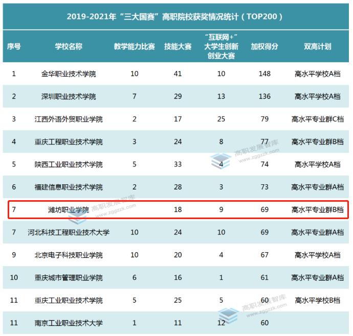 潍坊职业学院自动化高水平专业建设群在2019-2021年双高建设“三大国赛”排名中位列第七位。