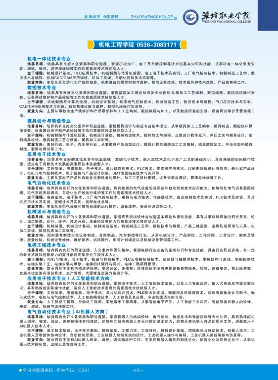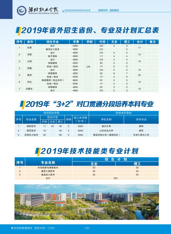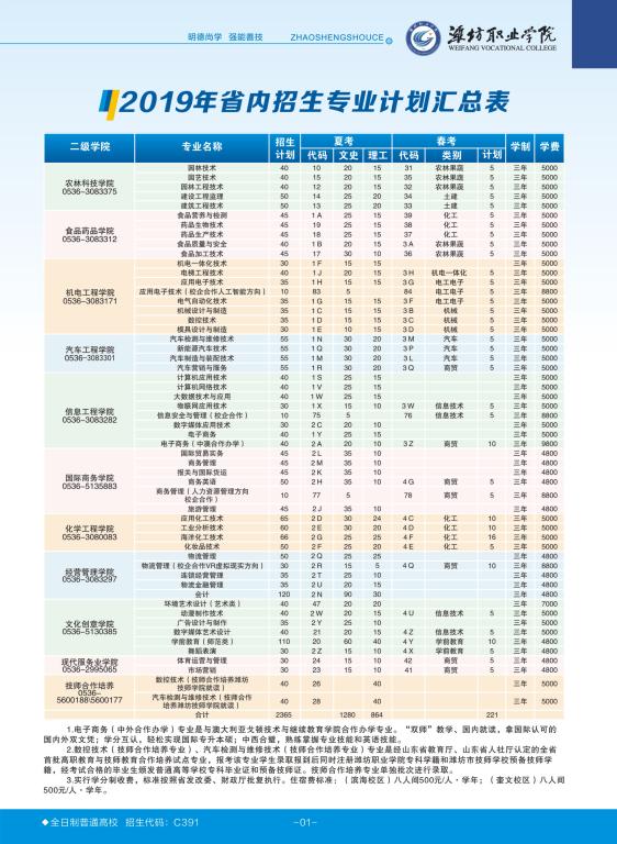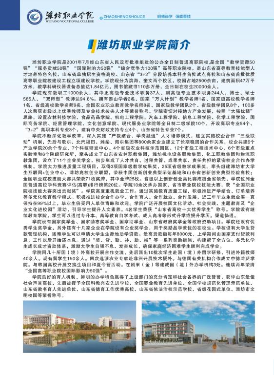 第一章 总则 第一条 为切实做好我院2019年招生工作,根据《中华人民共和国教育法》、《中华人民共和国高等教育法》和教育部、山东省教育厅有关规定,结合学院情况,制定本章程。 (一)本章程适用于潍坊职业学院普通高职招生。 (二)潍坊职业学院招生工作贯彻“公平竞争、公正选拔、公开程序、德智体全面考核、综合评价、择优录取”的原则。 (三)潍坊职业学院招生工作接受纪检监察部门、新闻媒体、考生及其家长、社会各界的监督。 第二章 学院概况 第二条 学校全称、校址:学校全称为潍坊职业学院,设有滨海和奎文两个校区。滨海校区位于山东省潍坊市滨海经济技术开发区科教创新区海安路06588号;奎文校区位于山东省潍坊市东风东街8029号。学院国标代码:12391。 第三条 办学层次、类型、批准成立时间、批准单位:潍坊职业学院是2001年7月经山东省人民政府批准设立、教育部备案的全日制公办大学专科层次普通高等职业院校。 第四条 学院基本情况 学院坐落在著名世界风筝都、中国文明城市、中国卫生城市、中国优秀旅游城市——山东省潍坊市,分为滨海、奎文两个校区,校园占地1900余亩,建筑面积47万平方米,教学科研仪器设备总值达1.84亿元,图书馆藏书110多万册,全日制在校生20000余人,其中高职生16600人。学院是全国“教学资源50强”“服务贡献50强”“国际影响力50强”“综合竞争力100强” 高等职业院校,是山东省高等教育技能型人才培养特色名校、山东省单独招生资格高校、山东省“3+2”分段培养本科生首批试点高校和山东省首批优质高等职业院校建设工程立项建设学校。 学院现有教职工1000余人,其中正高级专业技术职务37人、副高级专业技术职务244人,博士、硕士585人。拥有泰山学者2名、“国家级人才称号”教学名师1名、国家级高校教学名师1名、省级高校教学名师9名、全国农业职业教育教学名师8名、国家级教学团队2个、省级教学团队8个,100多人次荣获市级以上优秀教师及专业技术拔尖人才等荣誉称号。 学院密切对接地方产业发展,按照“大强优精”思路,设置全日制二级学院10个,开设高职专业54个、“3+2”高职本科专业3个、五年制高职专业17个,搭建起“中高本”贯通的技术技能人才培养体系。建有中央财政支持专业4个、山东省特色专业7个。 学院不断深化教学改革,深入实施“产教结合、学岗融通”人才培养模式,先后与歌尔、北汽福田等800余家企业建立了长期稳固的合作关系,校企共建产业学院6个、专业20余个。成立山东省农林职教集团和潍坊市机电设备职教集团、化工职教集团、现代物流业职教集团。开展混合所有制项目试点和现代学徒制试点,入选教育部第三批现代学徒制试点单位,被评为山东省校企一体化合作办学示范院校。形成校企合作“双元”办学机制和“知行合一,工学结合”育人机制。 学院大力推进质量工程,2个专业教学资源库入选国家级职业教育专业教学资源库备选库,参与3个国家级职业教育专业教学资源库、5个省级职业教育专业教学资源库建设。2个中央财政支持提升服务产业发展能力重点建设专业,2个中央财政支持建设的高职实训基地依托专业, 2个创新发展行动计划中的国家级骨干专业。取得3项国家级教学成果奖,25项省级教学成果奖。牵头组建潍坊市大学生互联网+创业中心、潍坊高校创业联盟,荣获中国创新创业典型示范基地和山东省创新创业典型经验高校。全国职业院校技能大赛共荣获65枚奖牌,其中金牌22枚。省级以上创新创业类比赛成绩全省领先,学院位列全国普通高校学科竞赛评估(高职)排行榜第20位。学院10余次承办国家、省市职业院校技能大赛,获“全国职业院校技能大赛突出贡献奖”。近三年毕业生就业率一直保持在99%以上,毕业生倍受用人单位青睐和欢迎。 学院广泛开展校园文化活动、社会实践、主题教育及“企业文化进校园”活动,引导学生提升人文素养。4名学生荣获“山东省高校十大优秀学生”称号。学院通过“奖、贷、勤、补、助、减”一系列奖助措施,构建起全方位、多元化学生成长成才资助体系。 学院设有滨海耐盐碱植物引种繁育、高分子新材料、大数据等14个省级、市级工程技术中心和8个市级重点实验室。先后完成国家、省、市科技厅(局)以上科研课题400余项,主参编著作、教材260余本,发表学术论文2700多篇,荣获市级以上科研奖励200余项。组建30支科技服务团队,开展技术服务5万人次,解决企业技术难题300余项,产生了良好的教学、经济和社会效益。 学院被确定为全省继续教育试点本科院校。牵头组建潍坊职业农民学院,成立社区教育学院,发挥全国农业职业技术教育培训示范基地和山东省现代农业技术等各级各类培训基地等平台作用,大力培养新型职业农民,加大社区居民、下岗职工、退伍军人等培训,年均培训近30000人次。 学院同几十所国(境)外高校开展合作交流,先后派出10批次学生赴国(境)外留学研修,引进外籍教师40余人。现有外国留学生150余人。四次选派农业专家赴非洲开展技术援外。与德国有关机构合作成立中德潍萨学院。与韩国高校开展交换生项目和夏令营活动。在刚果(金)等建成国(境)外办学机构3处。 学院良好的育人机制、鲜明的办学特色赢得了上级部门的充分肯定和社会各界的广泛赞誉,获评山东最佳社会声誉高校,先