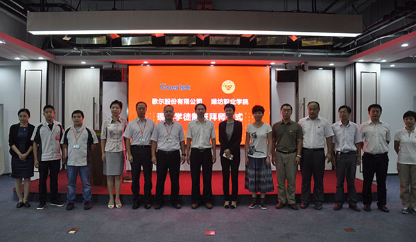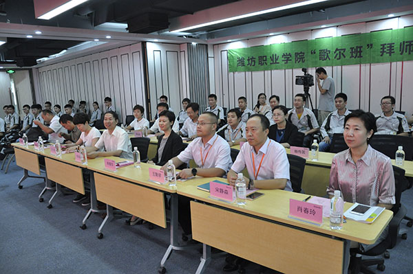 9月19日上午,我院数控技术专业现代学徒制班拜师仪式在歌尔股份有限公司会议室举行。学院副院长李瑞昌、歌尔股份有限公司副总裁李菁华出席。教务处、科技处、机电工程学院负责人,歌尔股份有限公司校企合作负责人和工作人员,以及学徒制班全体师徒参加。
